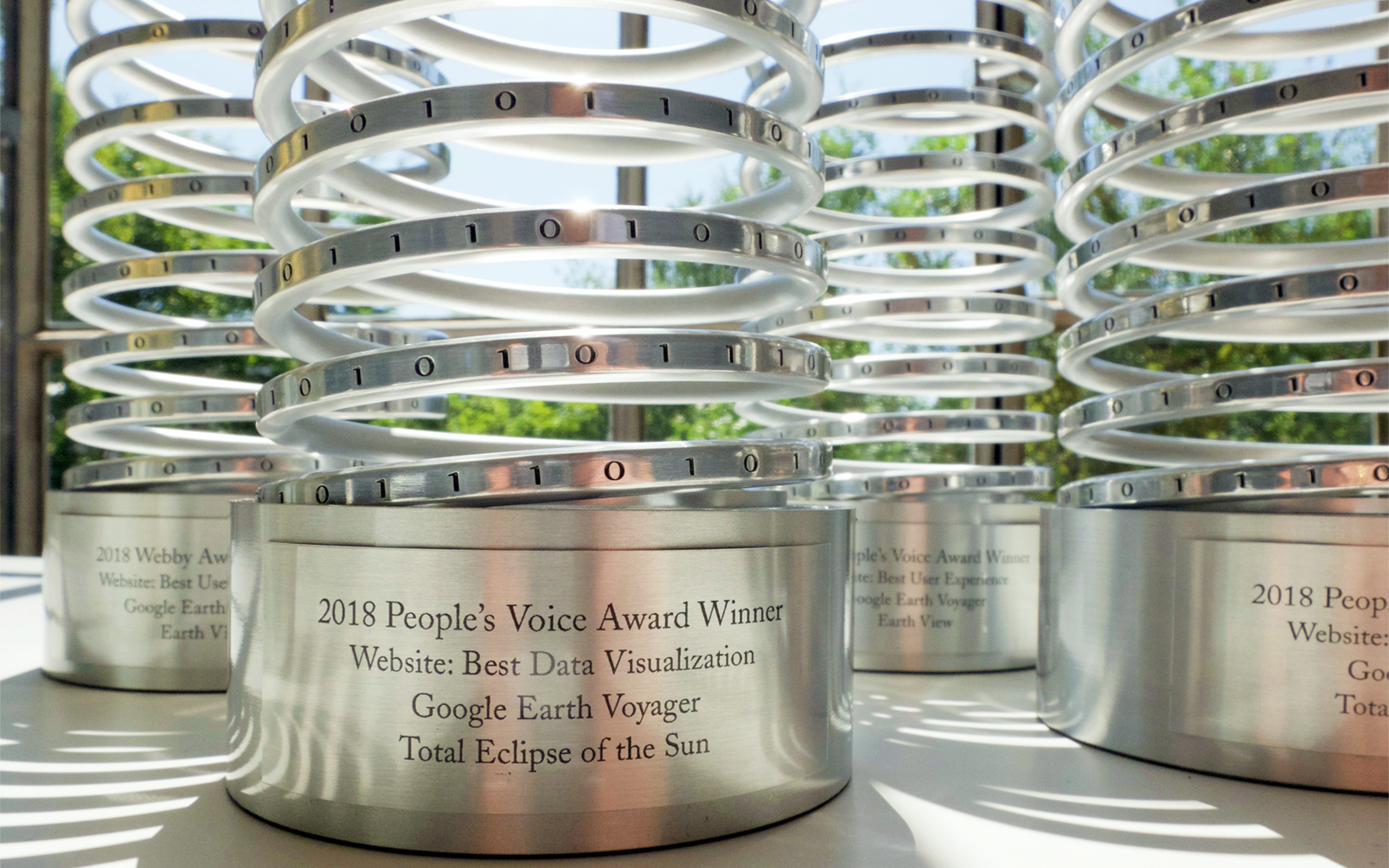 Mit zwei Projekten ins Rennen gegangen und vier Preise abgeräumt – noch nie waren wir bei den Webby Awards so erfolgreich wie 2018. Wir freuen uns riesig über die vielen Auszeichnungen für unsere Google Earth Voyager Stories “Google Earth View” und “Total Eclipse of the Sun”.