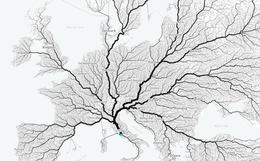 Alle Wege führen nach Rom? Das ist nicht nur daher gesagt: „Sie können die ewige Stadt über nahezu 500.000 Routen vom gesamten Kontinent aus erreichen“, kommentiert Moovellab. Ein Team koordinierte Startpunkte in einem 26.503.452 km² großen Raster, das ganz Europa abdeckt. Jede Zelle dieses Rasters beinhaltet den Startpunkt einer Tour nach Rom. Von 486.713 Startpunkten aus wollten sie herausfinden, wie sie nach Rom gelangen. Also erstellten sie einen Algorithmus, der eine Route für jede Reise berechnet. Hier ist das Ergebnis: Je öfter ein einzelnes Straßensegment verwendet wird, desto kräftiger wird es auf der Karte eingezeichnet. Wunderschön!